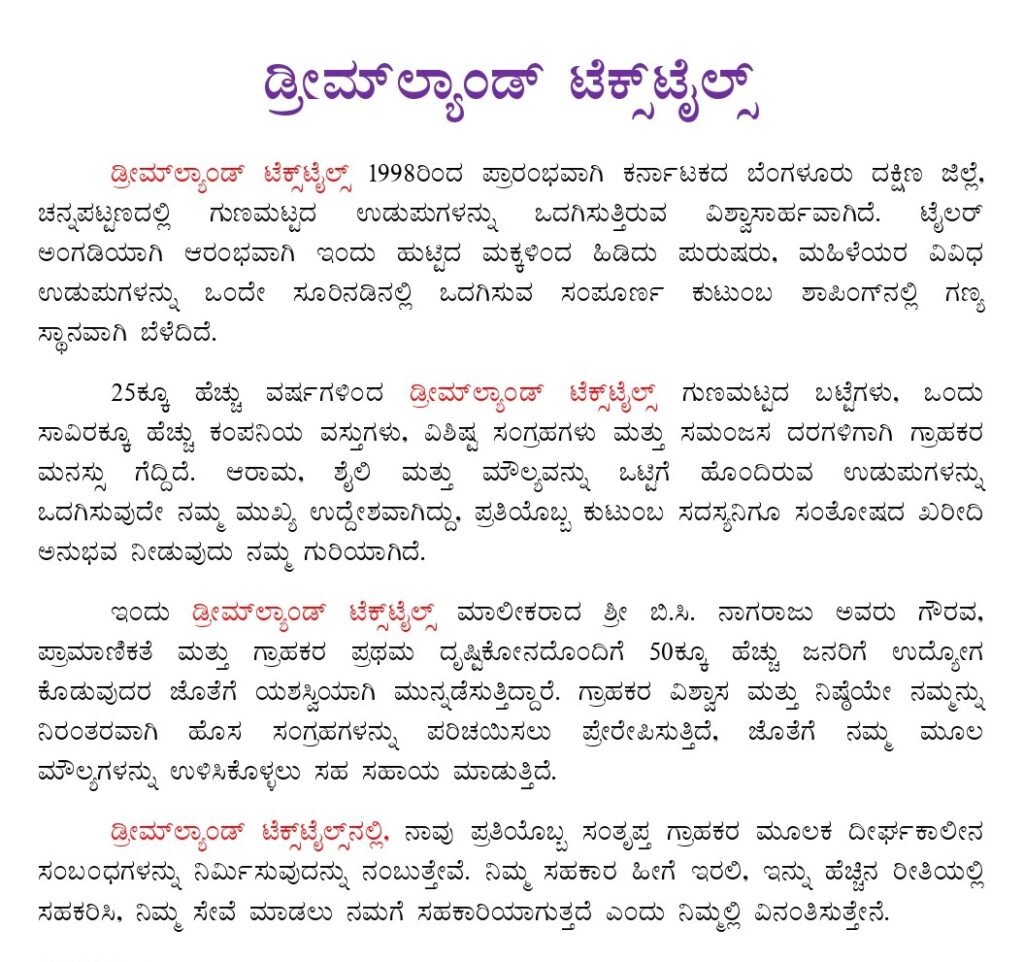 #2232/3-5/2, ಡ್ರೀಮ್ ಕಾಂಪ್ಲೆಕ್ಸ್, ಬಿ.ಎಂ. ರಸ್ತೆ, ಇಂಡಿಯನ್ ಪೆಟ್ರೋಲ್ ಬ್ಯಾಂಕ್ (ಗಾಂಧಿ ಭವನ) ಮುಂಭಾಗ, ಚನ್ನಪಟ್ಟಣ – 562160
